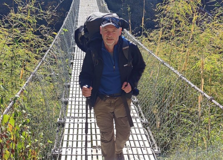 Für die 120 km benötigte der Jeep 5 Stunden. Wir wurden ordentlich durchgeschüttelt. Manchmal sind die Straßen in die Felsen gesprengt und unbefestigt: links die Felswand und rechts der Abgrund. Mal fehlt die Hälfte der Straße wegen Erdrutschen – mal fehlt mehr. Leitplanken? Unbekannt! Unterwegs herrliche Blicke auf 7.000er. Im Dorf Syabrubesi auf 1.400m endete die Fahrt. Die Auto-Piste würde weiter nach China führen, die Grenze ist nah. Meine Mitwanderer steckten am Flugplatz Lukla fest, so war ich alleine mit Guide Iswore und Träger Ram. Auf unserer Trekking-Route gibt es keine Straßen. Alles, was zum Leben gebraucht wird, wird von Menschen, mit Muli- oder Yak-Karawanen transportiert, vom Teebeutel bis zum Zementsack.